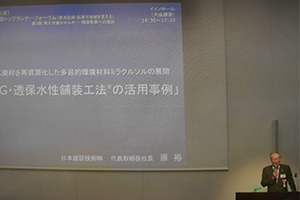 当社代表取締役社長の原は、第3部「再生可能エネルギー・環境事業への進出」の2番目に、ミラクルソルの展開「FWG透保水性舗装工法の活用例」を20分間にわたり発表した。