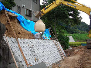 被災現場は基礎石積みと建築ブロックにより土留め擁壁の施工がなされていたが、