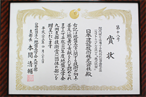 平成25年4月23日、九州大学西新プラザにて『平成24年度地盤工学会九州支部技術賞表彰式』が開催された。当社が佐賀大学低平地沿岸海域研究センターと連携し研究開発を実施してきた「間伐材を活用する軟弱地盤基礎工法〔ラフト&パイル工法〕の『施工試験』」が、地盤工学に関する技術の向上・普及に顕著な貢献をしたと認められ、代表取締役社長の原裕が『平成24年度地盤工学会九州支部技術賞(団体の部)』を受賞した。