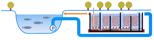 接触材(ミラクルソル)を充填した浄化装置に汚濁水を通水することによって、汚濁物質が沈殿、吸着されます。また、接触材の表面や気孔内部に生息した微生物の働きで汚濁水を浄化します。ミラクルソルは微細な気孔を有するため、酸素が多い領域と少ない領域が形成され、それぞれの領域が浄化にバランスよく働きます。